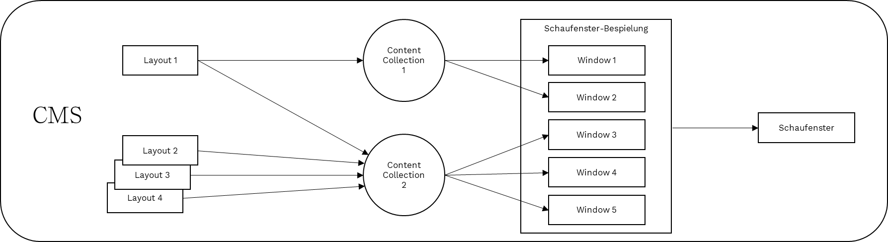 Im Content Management System (CMS) werden Layouts angelegt, in Content Collections zusammengefasst und den Screens (Bildschirmen) zugeordnet. Dabei gilt: