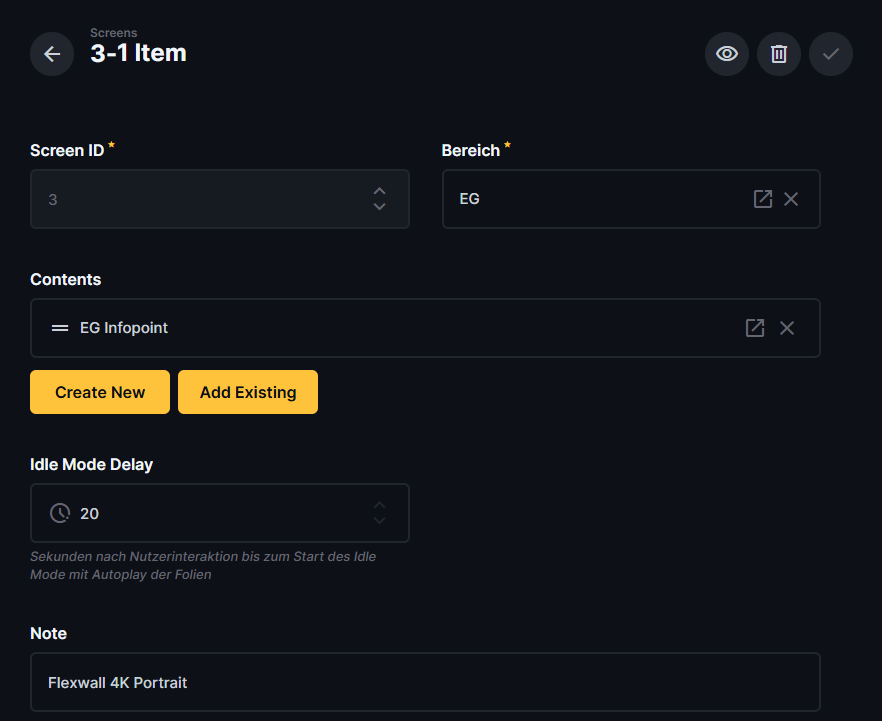 Alle Bildschirme, die in den Flexwalls eingesetzt werden, können über den Bereich Screens mit mit Inhalten befüllt werden. Dazu muss zunächst der entsprechende Screen aus der Liste ausgewählt werden. Die Screen ID befindet sich an der Rückseite des Zuspielers und kann nicht geändert werden.
