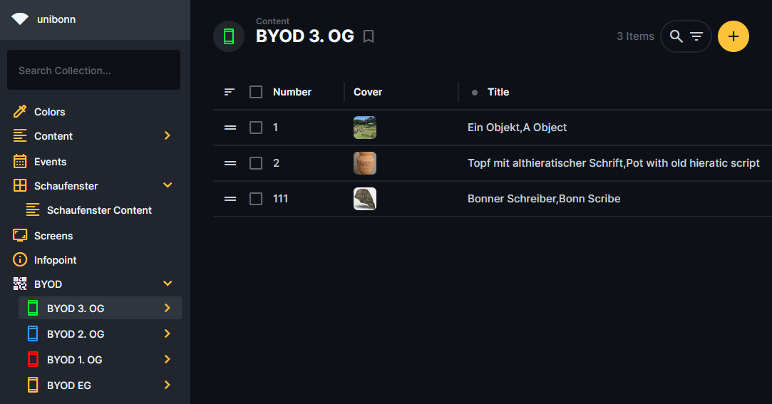 Zum erstellen eines C-Texts im CMS wird zunächst der entsprechende BYOD Bereich geöffnet. Je Stockwerk gibt es einen Bereich, unter dem alle bereits erstellten C-Texte aufgelistet werden.
