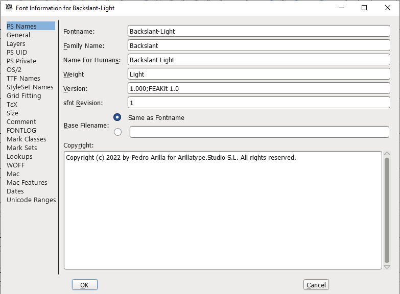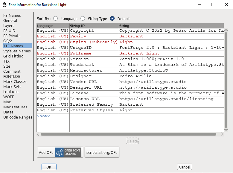 Die Fonts wurden in Font Forge bearbeitet, damit sie in VVVV richtig erkannt werden. Geändert wurde die Benennung, damit jeder Schnitt eine eigene Schrift im System ist.