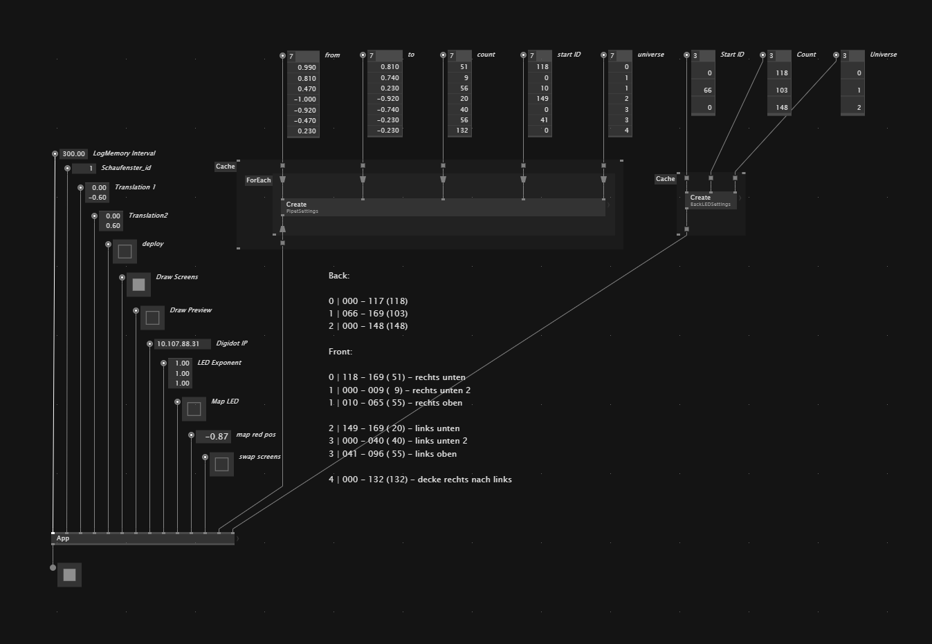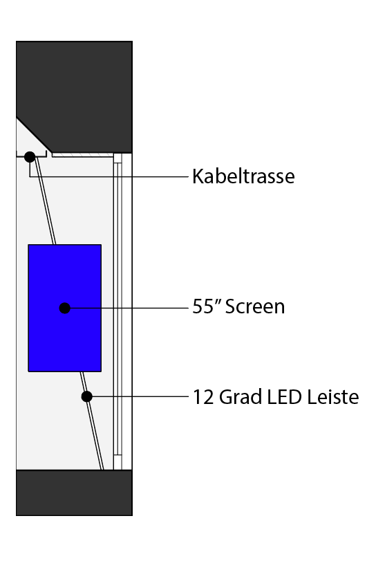 Der Grundsätzliche Aufbau der Installation im Schaufenster besteht aus 10 Monitoren mit dahinterliegenden LED Leisten. Pro Schaufenster sind 2 Monitore von einem Zuspielrechner bespielt.