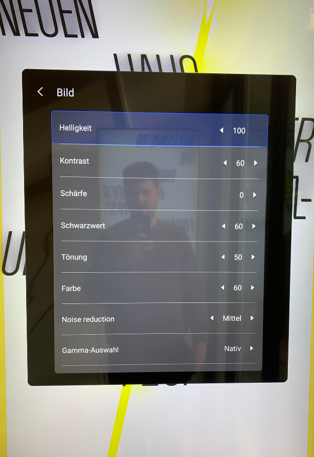 Auf den Bildschirmen wurden folgende Einstellungen vorgenommen, um die maximale Helligkeit für die Ansicht von außen zu erzeugen.